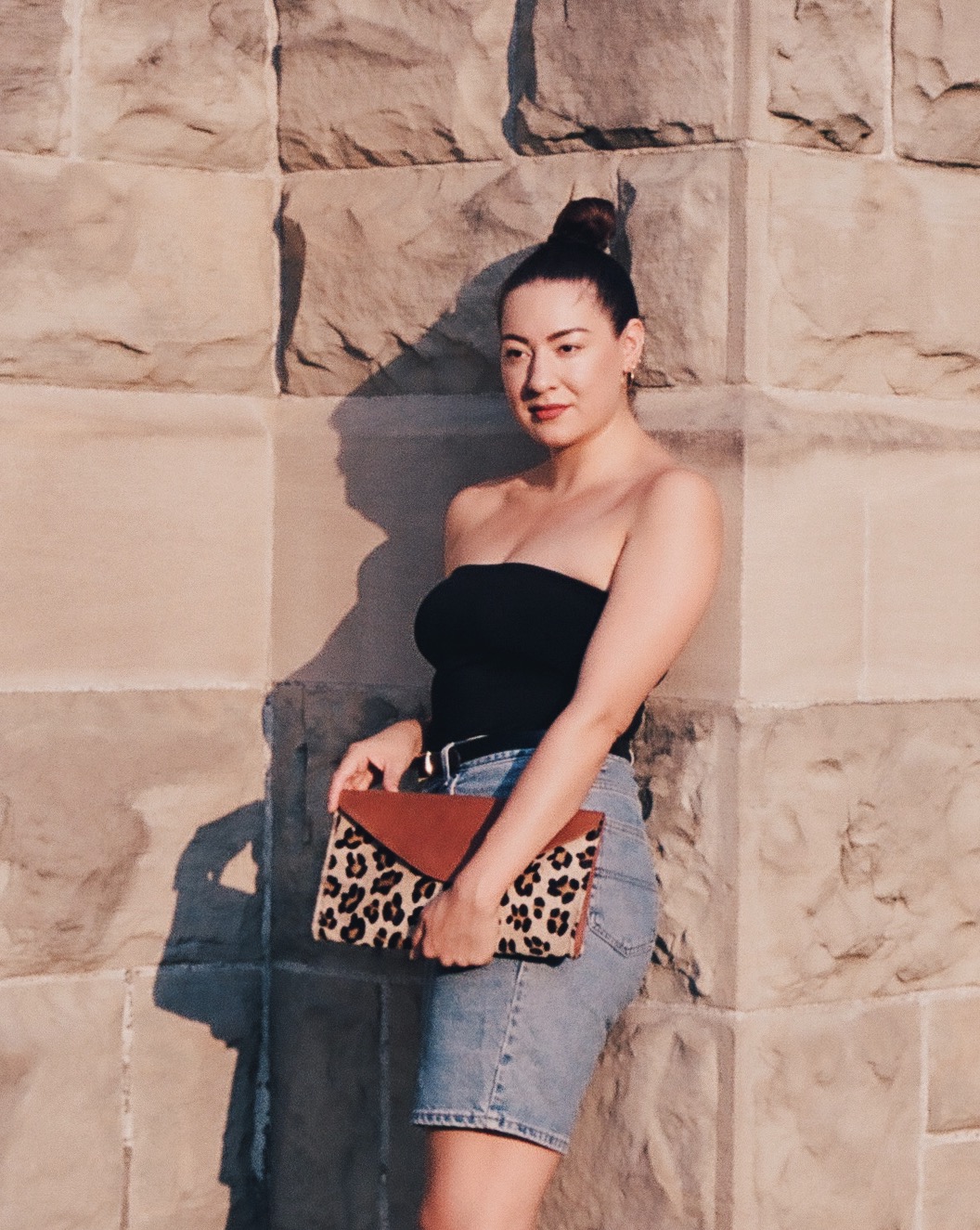 I love my Brave Leather leopard print clutch. First of all, everyone needs a wide variety of handbags to mix & match with their fierce looks. Second, who couldn’t use a little pop of animal prints in their daily outfits? (It’s a great way to add leopard to your look without going overboard.) From denim & a tube top to a wrap dress & heels, this clutch goes with everything.