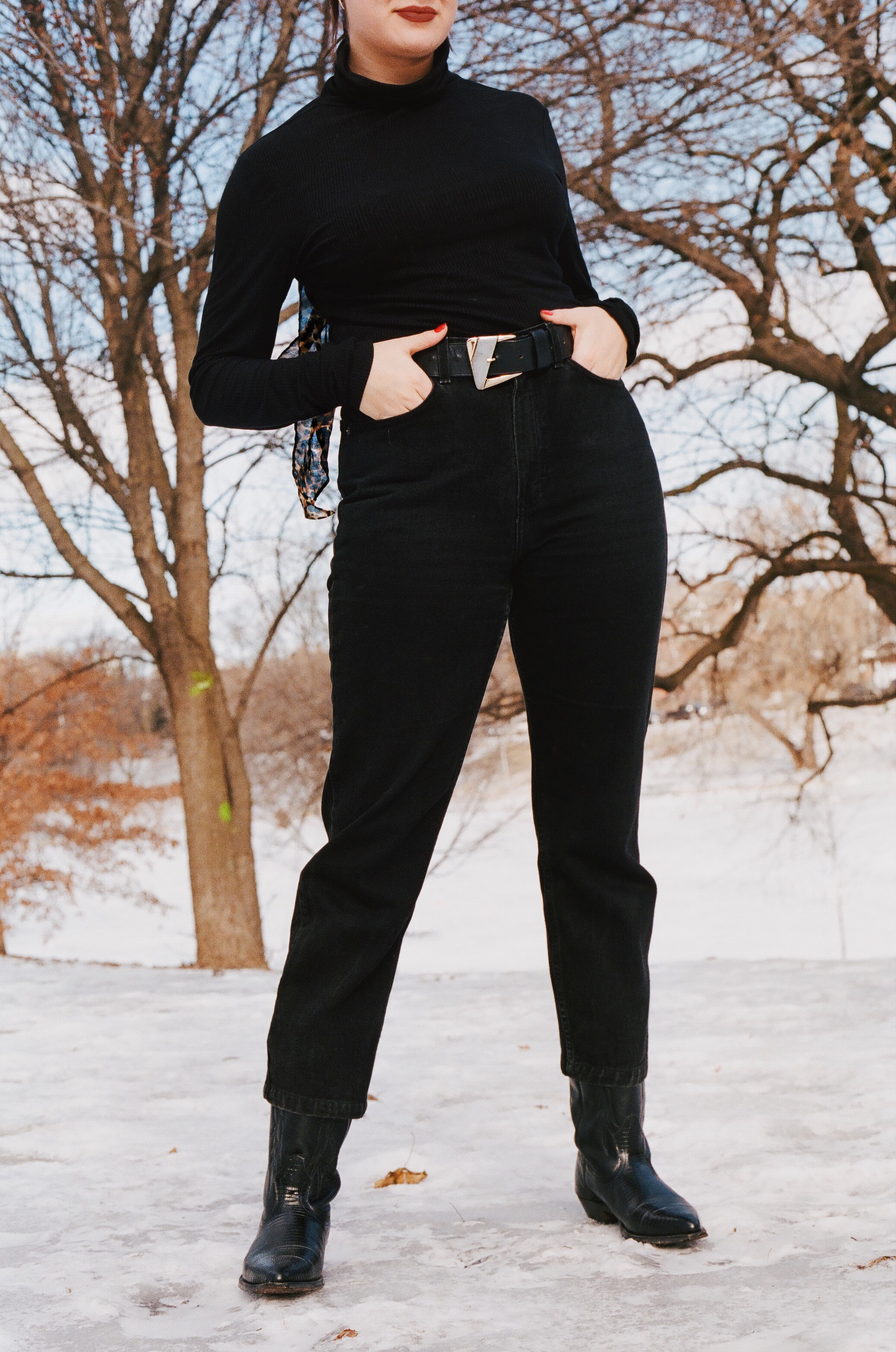 Style tip: When you’re wearing an all-over black-on-black outfit, an animal print something can be just what you need to take your look to the next level. See how my leopard scarf just adds a little bit of spice to this look? Also, those are my fabulous vintage cowboy boots! I’m obsessed with them.