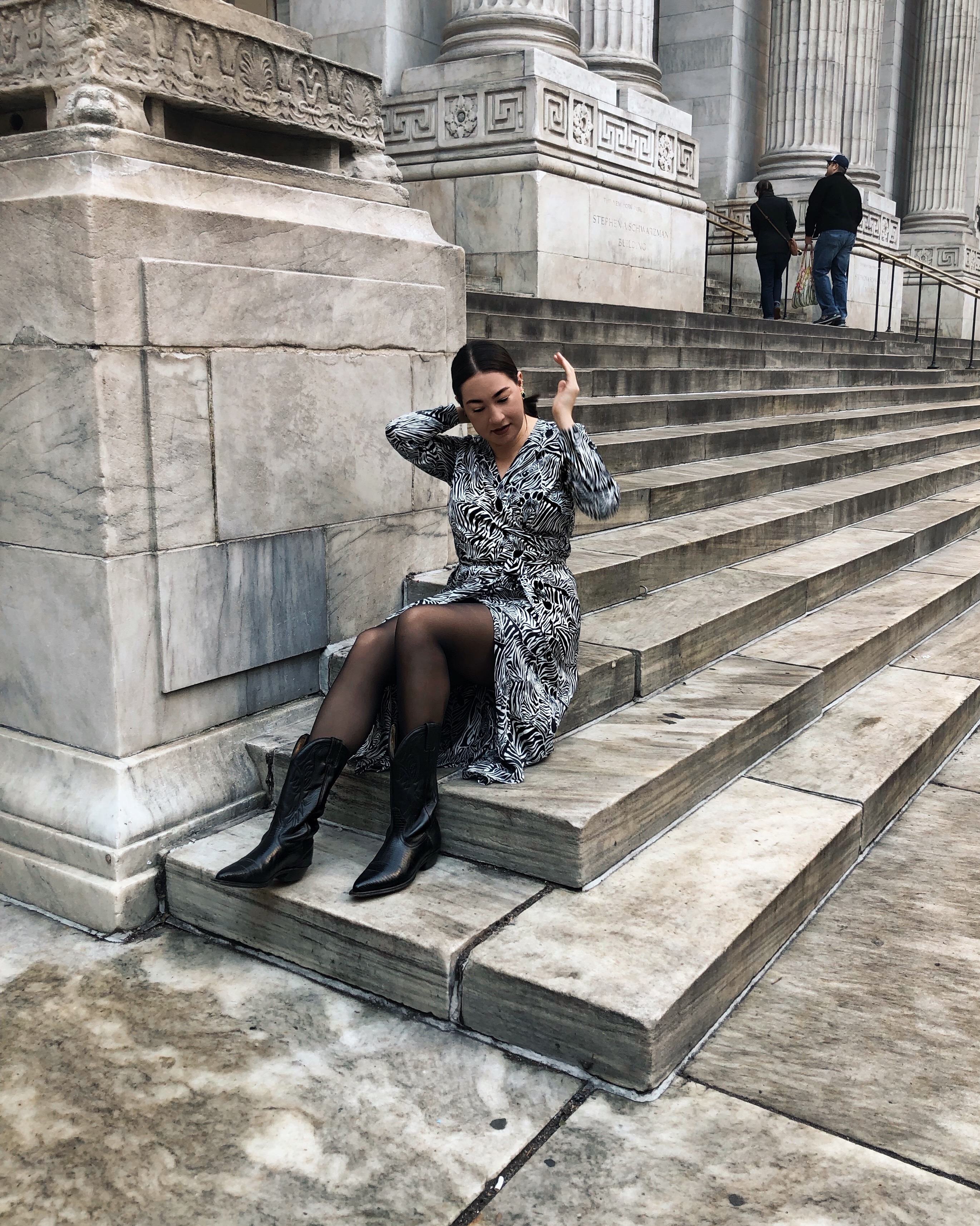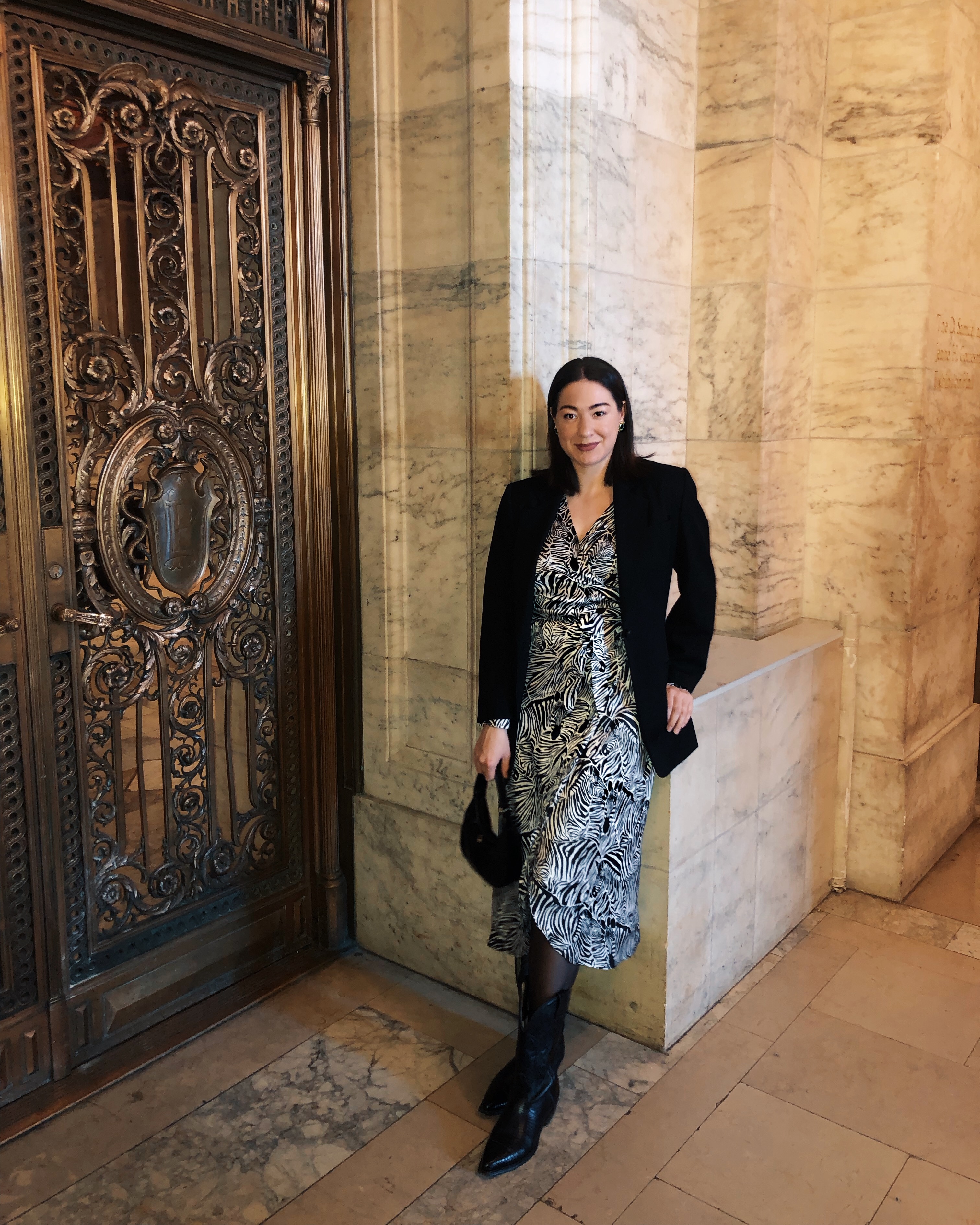 Also from Dancing Leopard, this zebra dress may not be the New York leopard print that I’d been seeing all over Manhattan, but it’s still fierce. If you look really closely you’ll see that it’s not just zebra stripes—there are actual zebras hiding in there! How cool is that? I paired it with my go-to blazer and my ultra-fave vintage cowboy boots.